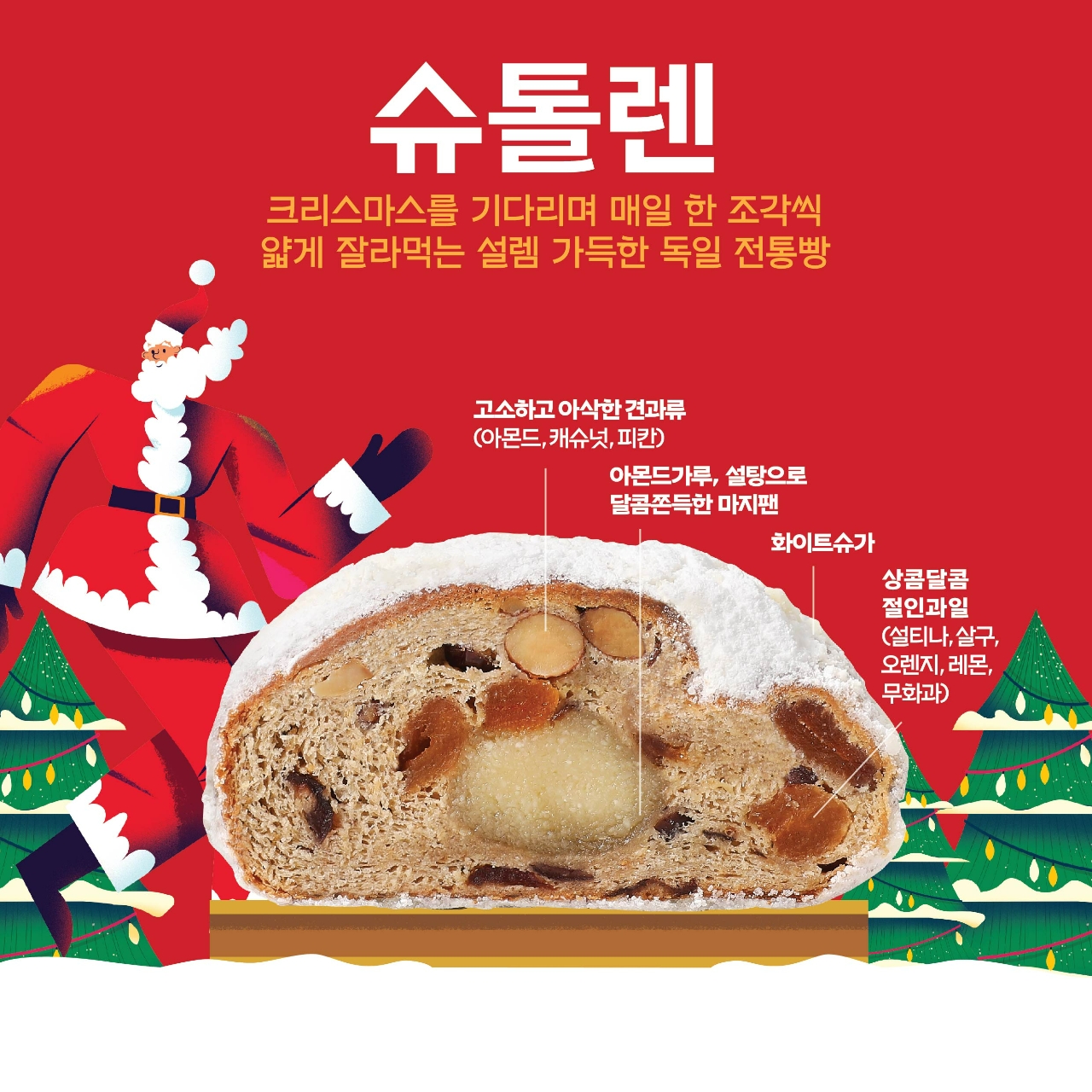 이번 ‘크리스마스 슈톨렌’은 고소한 아몬드 가루와 설탕으로 만든 달콤 쫀득한 ‘마지팬’과 설타나(건포도), 오렌지, 레몬, 살구, 무화과 등 상큼한 절인 과일에 아몬드, 캐슈넛, 피칸 등 고소하고 아삭한 견과류까지 다채로운 재료들이 어우러져 깊고 독특한 풍미를 느낄 수 있다. 또한 빵 겉면에는 입안에서 사르르 녹는 달콤한 슈가 파우더로 덮어 있어 겨울철 따뜻한 커피 또는 차와 함께 즐기기 좋다.