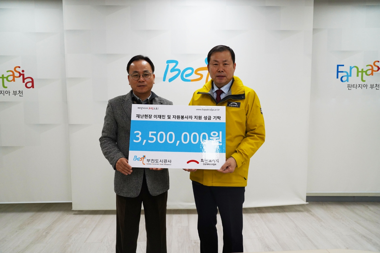 희망브리지 송필호 회장은 “연말을 맞아 따뜻한 나눔의 가치를 실현한 부천도시공사 임직원께 깊은 존경과 감사의 말씀을 드린다”며 “희망브리지는 공사의 뜻이 이재민과 소외계층 등에 잘 전해질 수 있도록 최선을 다하겠다”고 말했다.