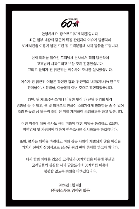 한편, 논란이 된 제품으로 피해를 입은 고객에게 60계 치킨은 직접 방문해 사과하고 보상 조치를 진행했다.