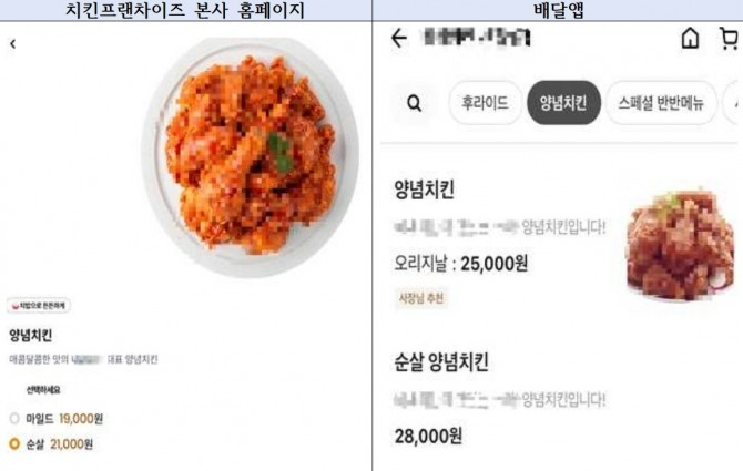 그 결과 조사대상 주요 치킨프랜차이즈 6개업체 중 3개업체에서 공식홈페이지 가격보다 배달앱 가격이 평균 1978원 높은 것으로 나타났으며 동일제품의 공식홈페이지 가격과 배달앱 가격이 최대 7000원 차이가 나타나 홈페이지 가격대비 33.3% 비싸게 판매하는 업체도 있었다.