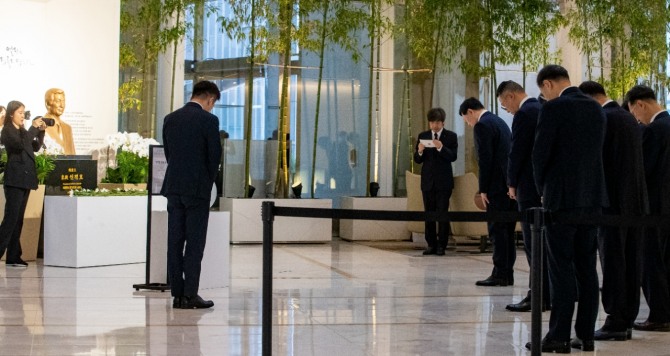 18일 오전  서울 송파구 롯데월드타워에서 열린 신격호 롯데 명예회장 추도식에서 신동빈 롯데 회장을 비롯한 사장단들이 신격호 명예회장 흉상 앞에서 묵념하고 있다. 사진=송수연 기자이미지 확대보기