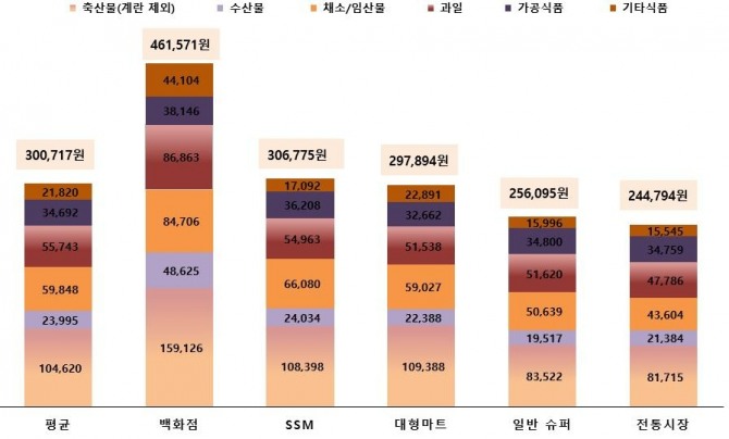 유통업태별로 보면 전통시장이 평균 24만4794원으로 가장 저렴하고, 일반 슈퍼마켓이 25만6095원, 대형마트 29만7894원, SSM 30만6775원, 백화점 46만1571원 순이었다. 다른 유통업태에 비해 제품 가격대가 높은 백화점을 제외한 평균 비용은 약 27만6389원이었으며 전통시장과 일반 슈퍼마켓은 약 24만~25만 원대, 대형마트와 SSM은 약 29만~30만 원에서 제수용품을 구매할 수 있는 것으로 나타났다.