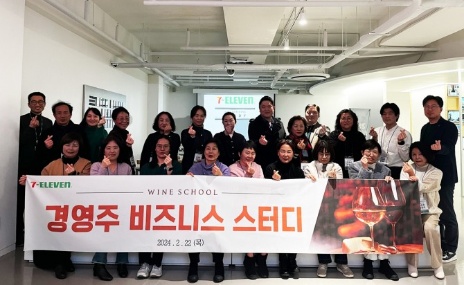 제1회 경영주 비즈니스 스터디는 ‘와인스쿨’이라는 테마로 진행됐다. 세븐일레븐은 22일 오후 경영주 20여명과 함께 주류 소싱 파트너사인 ‘아영FBC’를 방문했다. 아영FBC의 아카이브룸(브랜드 기록물을 보관하는 공간)을 견학 후 별도 교육장에서 와인 상식, 역사, 예절 등 와인 관련 수업을 받는 시간을 가졌다.