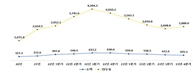 식용유도 주 원재료인 대두유(1.8L 기준) 가격이 2022년 3분기를 정점으로 하락세를 보였다. 지난해 3분기는 2698.8원으로 전년 같은 분기 대비 38.6% 하락, 4분기에도 전년 같은 분기 28.7%나 하락해 2022년 1분기 이전 수준으로 돌아가고 있음을 확인할 수 있었다.
