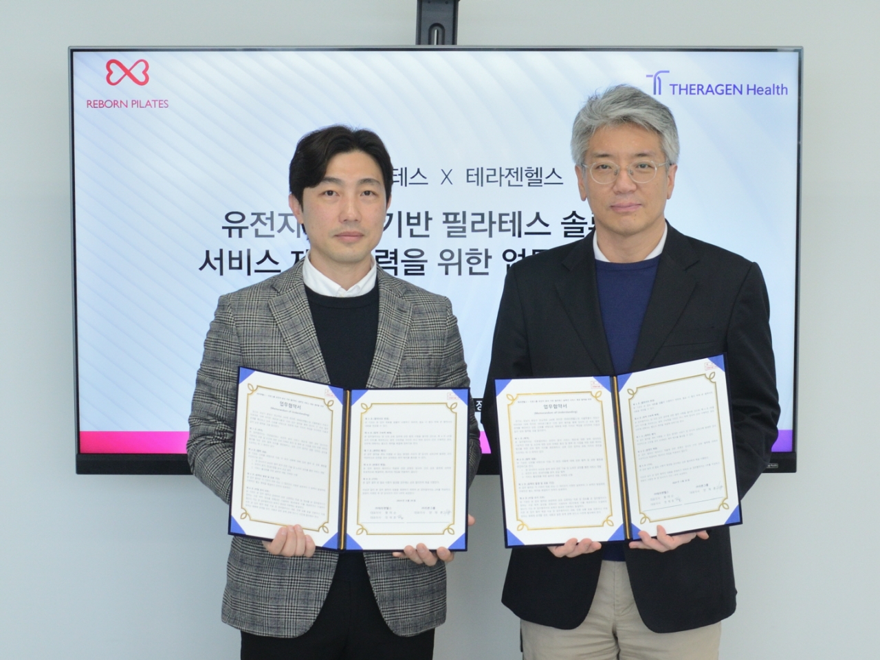 판교 테라젠헬스 본사에서 열린 협약식에는 정재호 테라젠헬스 대표이사와 양병희 리본필라테스 대표이사 등 양사 주요 관계자가 참석했다.