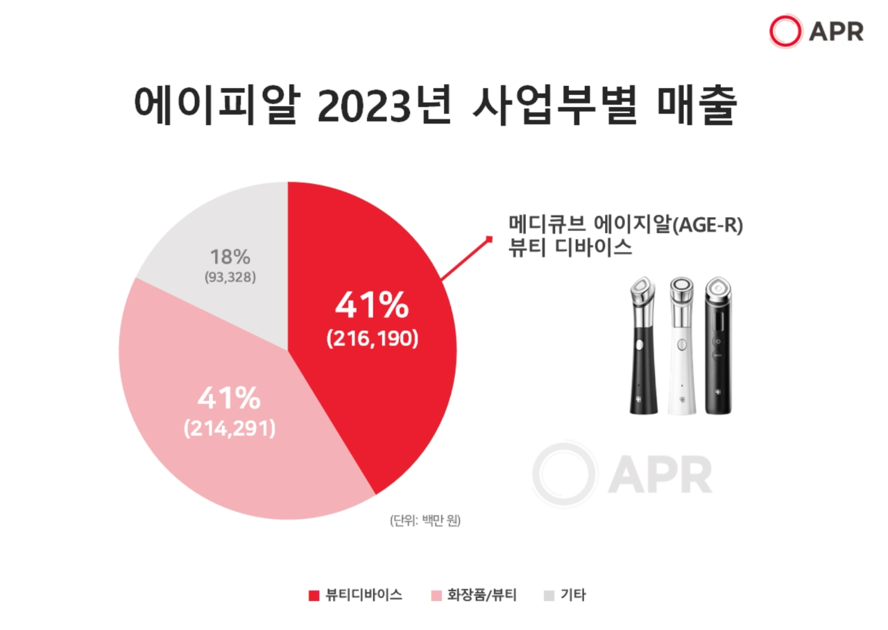 실적 성장을 견인한 것은 ‘메디큐브 에이지알(AGE-R)’ 뷰티 디바이스였다. 지난해 에이피알은 국내외 시장에 105만 대의 뷰티 디바이스를 판매했다. 2022년도 판매량이 60만 대였던 것을 감안하면 1년 사이 약 75%가 상승한 것이다. 판매량이 상승함에 따라 매출도 같이 올라 뷰티 디바이스 매출은 사상 처음으로 2000억원을 넘긴 2162억원을 기록했다.