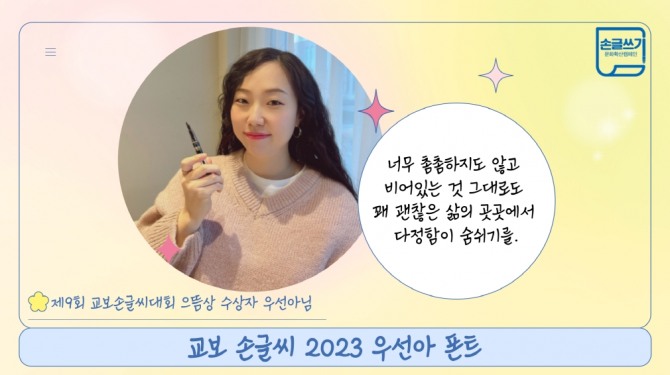 이미지 확대보기3일 교보문고에 따르면 윤디자인그룹이 참여한 ‘교보 손글씨 2023 우선아’ 폰트는 한글 유니코드(Unicode)기반 1만1172자, Basic Latin 94자, KS특수문자 986자를 지원한다. 우선아씨의 손글씨 인상과 특징을 살리면서 구조와 획의 뭉침을 개선하여 다양한 환경에서 쓰일 수 있도록 가독성과 판독성을 높였다.
