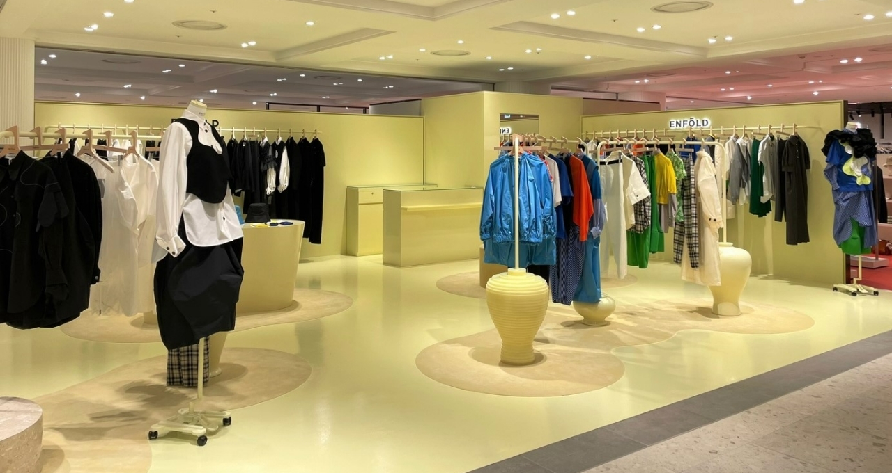 2층 해외 컨템포러리 전문관에 위치한 이번 매장은 백일몽(daydream)을 콘셉트로, 매장 전체를 연한 노란색으로 통일해 마치 꿈속에 있는 듯한 몽환적인 분위기를 연출했다. 행거, 가구, 조형물 등 전체적으로 부드러운 곡선 디자인을 적용해 엔폴드의 우아한 실루엣을 표현했다.