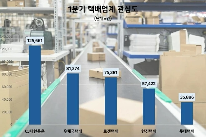 이미지 확대보기15일 데이터앤리서치에 따르면 올해 1분기 CJ대한통운, 우체국택배, 로젠택배, 한진택배, 롯데택배 등 주요 택배사 중 CJ대한통운이 택배업계 관심도 1위를 차지했다.