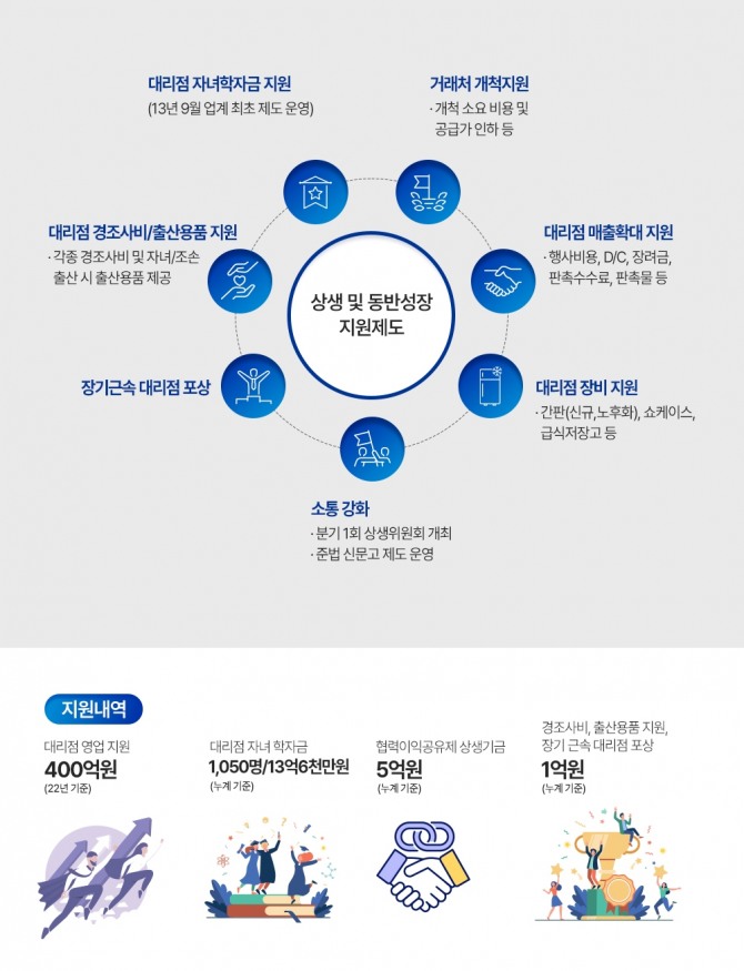 이 밖에도 △장기운영 대리점 포상 △대리점 자녀, 손주 출생 시 분유 및 육아용품 지원 △질병 및 상해로 갑작스러운 위기에 처한 대리점을 위한 ‘긴급생계자금’ 무이자 대출 등 만족도 높은 복지 제도를 시행 중이다.