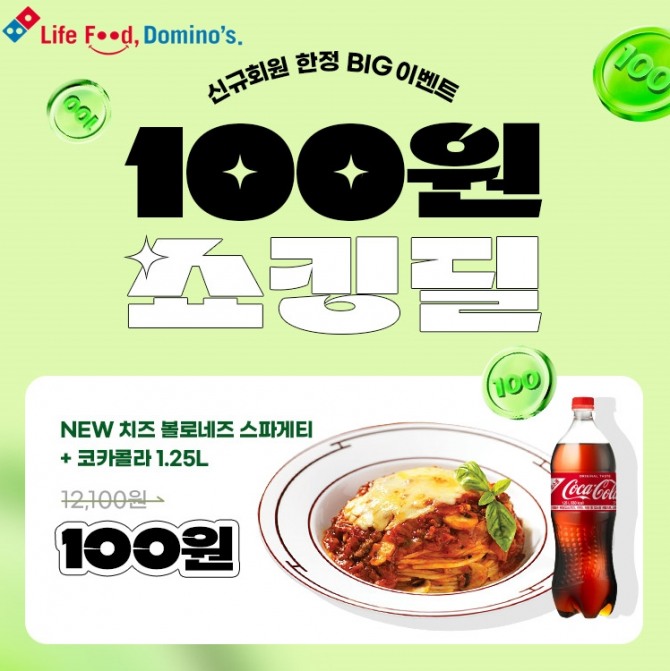 이미지 확대보기24일 도미노피자에 따르면 오는 26일과 27일 새롭게 신규 가입한 회원 중 모든 피자 L 구매 시 NEW 치즈 볼로네즈 스파게티+콜라 1.25L를 100원에 이용할 수 있는 쿠폰을 선착순 1만 명에게 제공한다.
