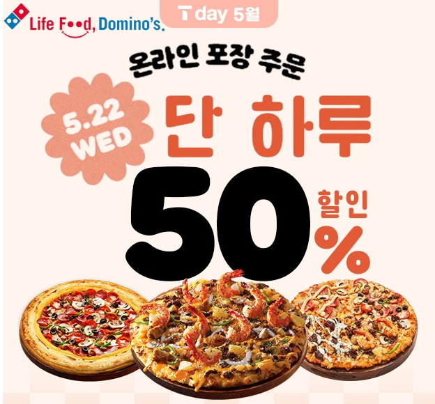 도미노피자 관계자는 “도미노피자와 SKT를 사랑해주시는 고객분들을 위해 이달에도 SKT T day 프로모션을 진행한다”며 “나들이 가기 좋은 5월, SKT T day 혜택을 통해 50% 할인된 도미노피자와 함께 하시기 바란다”고 말했다.