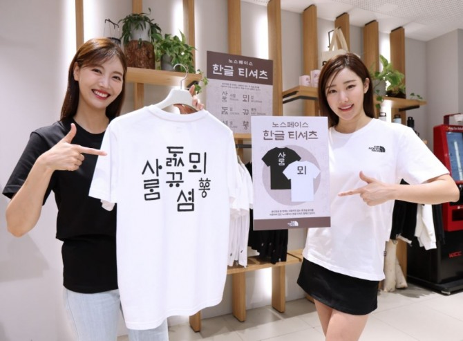 ‘노스페이스 한글 티셔츠’는 검정색과 흰색 바탕 위에 흰색과 검정색의 힘 있는 붓글씨 느낌의 폰트를 적용해 정갈한 느낌을 담은 것이 특징으로, 노스페이스 공식 온라인몰과 명동점 및 성남본점에서만 만나볼 수 있다.