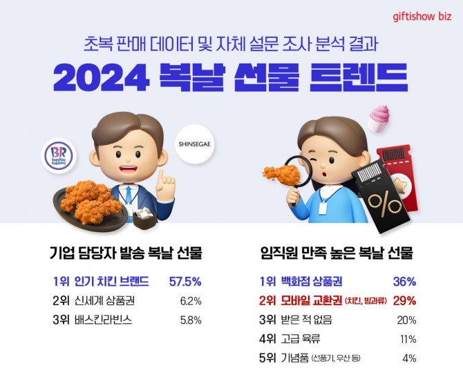 이미지 확대보기KT알파가 운영하는 기업 전용 모바일 쿠폰 대량발송 서비스 ‘기프티쇼 비즈’가 중복을 앞두고 지난 초복(15일)에 발송된 인기 상품 결과를 공개했다. 기프티쇼 비즈는 임직원 복지 쿠폰 발송, 보험·렌탈 구매 사은품, 프로모션·이벤트 경품 발송 등에 이용할 수 있는 온라인 서비스다.