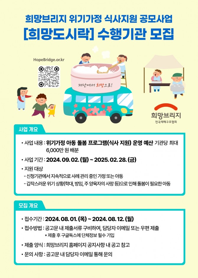 이미지 확대보기사업의 지원 대상은 신청기관·단체가 지속적으로 관리 중인 가정·아동 및 갑작스러운 위기 상황으로 돌봄이 필요한 아동이다. 사업 수행 기간은 오는 9월 2일부터 내년 2월 28일까지며 접수 기간은 내달 1일부터 12일까지다. 선정된 기관은 최대 6000만원까지 예산을 지원받을 수 있으며, 보다 자세한 내용은 희망브리지 홈페이지 공지 사항에서 확인할 수 있다.