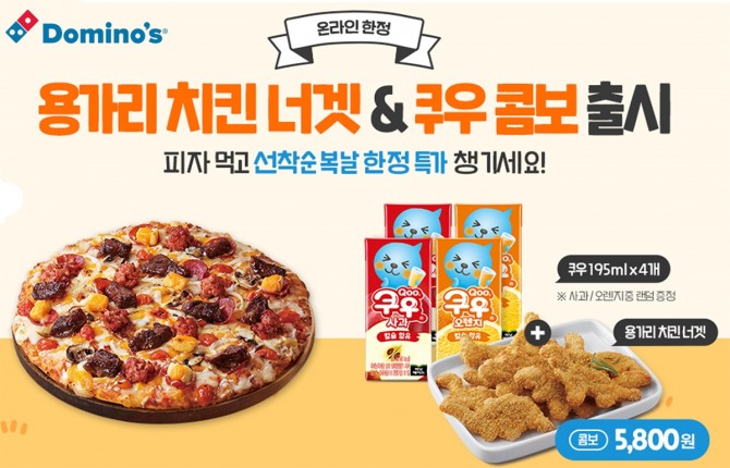 이미지 확대보기14일 유통업계에 따르면 도미노피자는 고소하고 담백해 남녀노소 모두 좋아하는 용가리 치킨 너겟과 상큼한 맛의 쿠우 음료 195ml 4개로 구성된 말복 콤보 세트를 출시한다.