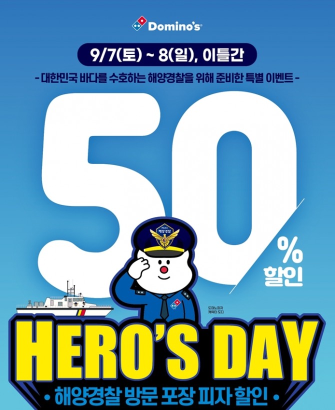 이미지 확대보기2일 도미노피자에 따르면 이번 도미노피자의 ‘해양경찰 히어로즈데이’ 프로모션은 해양경찰의 날(9월 10일)을 앞두고 오는 7일부터 8일까지 해양경찰이라면 모든 피자(M, L) 오프라인 방문 포장 주문 시 50% 할인 혜택을 제공한다.