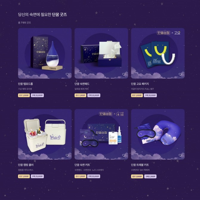 단꿈 타로점 등 간단한 테스트도 즐길 수 있다. 해당 게임을 진행하면 ‘단꿈 포인트’를 지급하는데, 이를 다양한 숙면 관련 굿즈로 교환할 수 있다. 경동나비엔은 리뉴얼을 통해 굿즈 라인업도 확대했다. ‘티빙(TVING)’, ‘지니(genie)’, ‘밀리의 서재’ 이용권부터 기상 예측 유리병 ‘단꿈 템포드롭’, 이갈이 방지가드 세트 ‘단꿈 고요 패키지’까지 다양한 굿즈를 만날 수 있다.