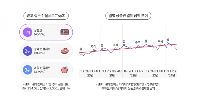 이미지 확대보기10일 롯데멤버스가 리서치 플랫폼 라임을 통해 추석 선물 계획 설문조사 결과를 담은 트렌드 뉴스레터 ‘요즘, 우리는’을 공개했다. 이번 설문은 8월 16일~20일 5일간 전국 성인 남녀 2000명을 대상으로 진행했다.(표본오차 95% 신뢰수준에 ±2.19%p)