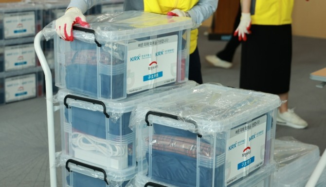 이미지 확대보기30일 희망브리지에 따르면 이번 키트는 속옷, 치약, 휴지, 방역용 마스크 등 생필품 20종으로 구성됐으며 LH한국토지주택공사, KRX한국거래소의 후원 및 임직원 봉사활동으로 제작했다.