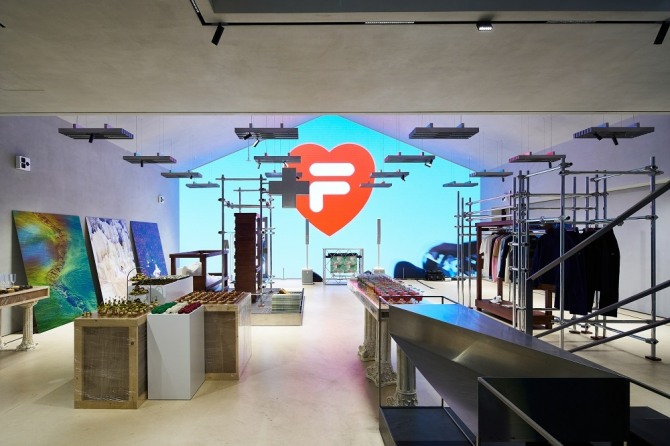 무신사 엠프티 성수에서 진행되는 FILA+ 팝업 스토어는 건물 전면이 휠라의 상징적인 F 박스 로고와 FILA+ 브랜드 색상인 그린, 화이트, 레드로 장식되어 브랜드가 가진 이탈리아 헤리티지를 여실히 보여줬다.