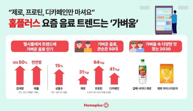 가벼운 음료에 대한 관심은 매출에도 나타났다. 최근 3개월간 홈플러스 온라인의 제로, 프로틴, 디카페인 음료 매출은 전 연령대에서 고르게 상승했다. 연령대가 올라갈수록 매출 신장률과 검색량도 점차 증가했다.