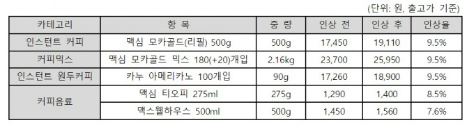 이미지 확대보기1일 동서식품에 따르면 이번 조정으로 맥심 모카골드 리필 500g 제품은 1만 7450원에서 1만 9110원으로, 맥심 모카골드 커피믹스 2.16kg 제품은 2만 3700원에서 2만 5950원으로, 카누 아메리카노 90g 제품은 1만 7260원에서 1만 8900원으로, 맥심 티오피 275ml 제품은 1290원에서 1400원으로, 맥스웰하우스 500ml 제품은 1450원에서 1560원으로 인상된다.