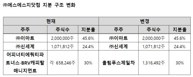 한편, 지난 6월 신세계는 기존 FI가 보유중인 ㈜에스에스지닷컴의 보통주 131만6492주를 올해 말까지 ㈜이마트-㈜신세계가 지정하는 단수 또는 복수의 제3자에게 매도할 예정이라고 밝힌 바 있다.