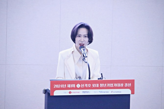 이미지 확대보기장혜선 롯데장학재단 이사장의 말이다. 롯데장학재단은 지난 25일 서울 송파구 롯데월드타워 SKY31 컨벤션에서 ‘제1회 신격호 롯데 청년기업가대상(신격호창업대회)’의 결선과 시상식을 개최했다.