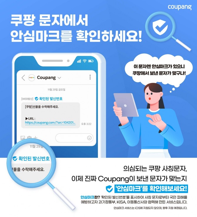 앞으로 쿠팡 공식 고객센터가 발송하는 문자메시지는 쿠팡 로고 이미지와 함께 ‘안심마크’가 내용에 표시된다. 체크 표시가 있는 방패 심볼 마크와 ‘확인된 발신번호’라는 문구가 안심마크다. 이 안심마크는 문자메시지 상단에 표시되며 발신자가 쿠팡인지 아닌지 단번에 구별할 수 있다. 안심마크는 KISA가 지정한 기관만 표시가 가능한 내용으로 위·변조가 어렵다.