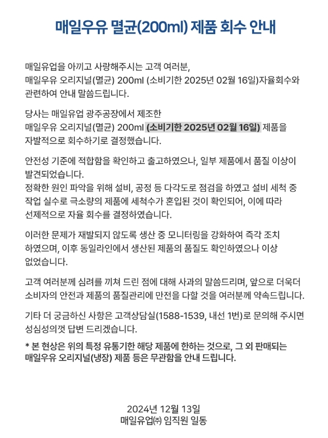 이미지 확대보기매일유업에 따르면, 회수 품목은 광주공장에서 제조한 제품 중 소비기한이 내년 2월 16일인 제품으로 특정 유통기한 제품만 해당되고, 그 외 판매되는 매일우유 오리지널(냉장) 제품은 이상 없다고 밝혔다.