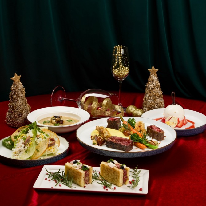 캐비아를 올린 스테이크 타르타르, 앤초비를 곁들인 시저 샐러드, 블랙 트러플을 올린 버섯 스프, 안심 등심 립아이 등 부위별 모둠 한우 스테이크, 바닐라 무스와 레몬 크림이 곁들여진 화이트 크리스마스 돔 케이크 등이 제공되며 모앳샹동 1잔도 제공한다.
