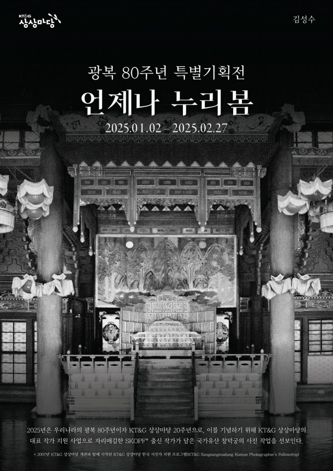 KT&G 상상마당 관계자는 “이번 사진전을 통해 관람객들이 창덕궁의 역사적 가치와 광복 80주년의 의미를 생각할 수 있는 소중한 시간을 갖길 바란다”며 “앞으로도 문화예술계의 지속 가능한 발전을 위해 다양한 프로그램을 선보일 것”이라고 말했다.