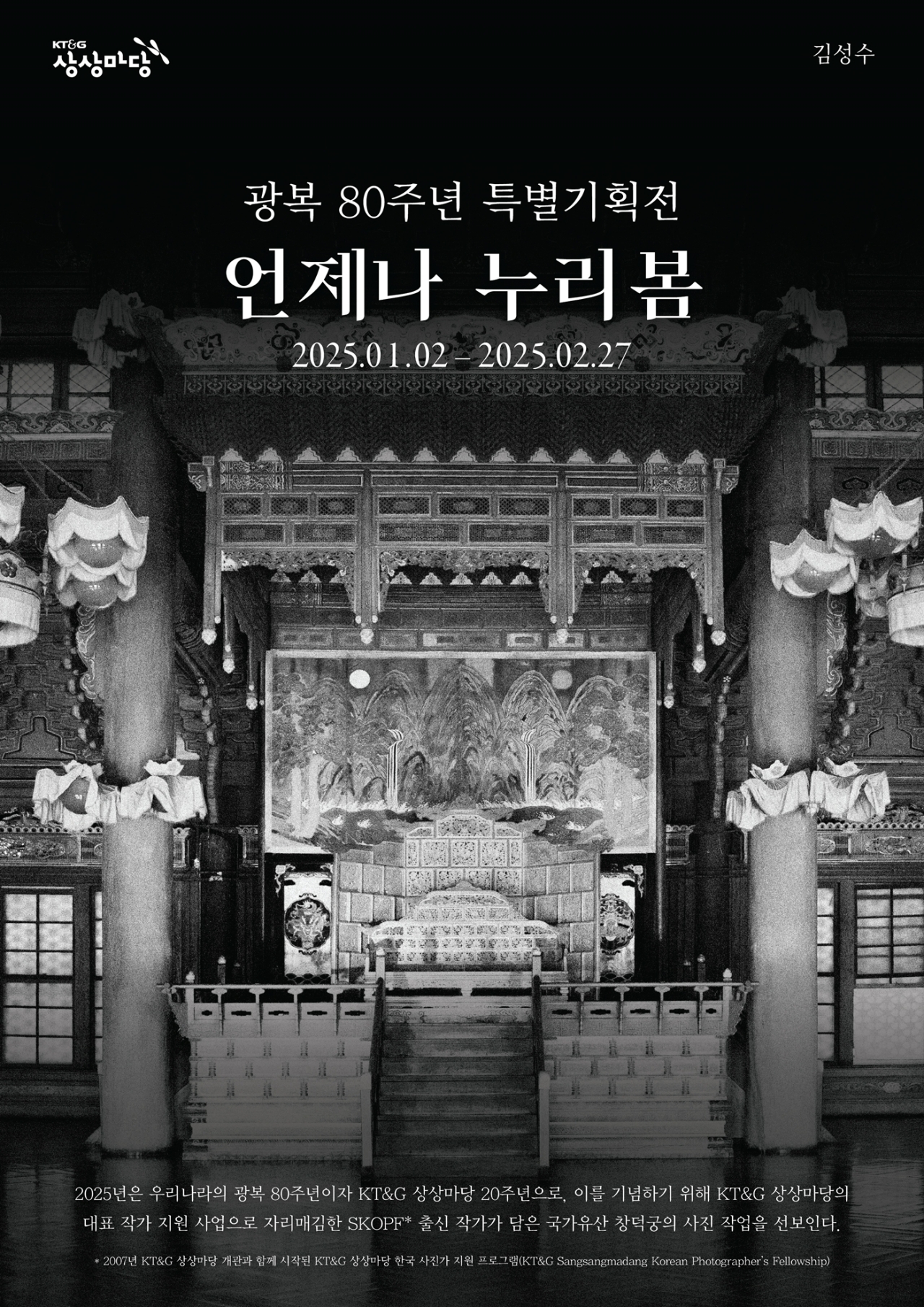 이번 사진전에는 ‘제8회 KT&G SKOPF’ 올해의 사진가와 뮤지엄한미의 ‘MH Talent Portfolio’에 선정돼 국내에서 주목받는 김성수 사진가가 참여했다. 관람객들은 인정전, 낙선재 등 창덕궁 내 전각과 후원을 사진가 특유의 매력적인 흑백 사진으로 감상할 수 있으며, 입장료는 무료다.