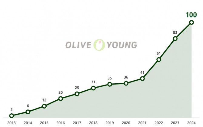 이미지 확대보기8일 CJ올리브영에 따르면 입점 브랜드 중 올리브영에서 2024년 연매출 100억원 이상을 기록한 브랜드 수가 처음으로 100개를 기록했다. 2013년 첫 100억 브랜드가 탄생한지 약 10년 만이다.