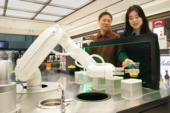 이미지 확대보기16일 롯데면세점에 따르면 로봇 바텐더 매장은 롯데면세점이 2023년 창이공항점에 처음 선보여 고객들의 뜨거운 반응을 이끌었다. 이번에 김포공항점을 통해 국내 공항에 처음 모습을 공개했다. 로봇 바텐더 매장은 국내 협동 로봇 선두 업체인 ‘두산로보틱스’와 협업으로 조성됐다.