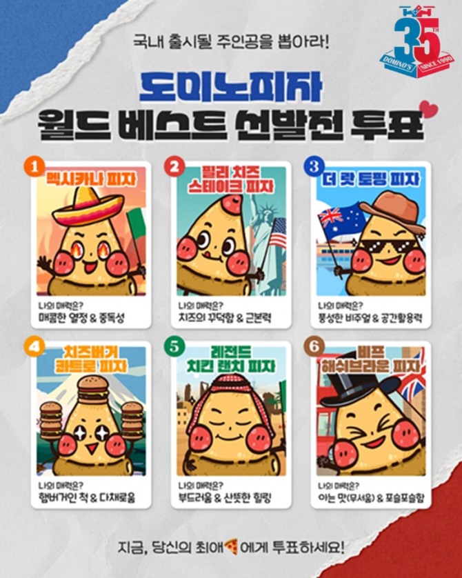 이미지 확대보기21일 도미노피자에 따르면 한국 진출 35주년을 기념해 해외 도미노피자에서 판매 중인 6개의 인기 제품 중 고객 투표를 통해 1등을 출시하는 ‘월드 베스트 피자 선발전’ 투표를 오는 26일까지 도미노피자 공식 인스타그램에서 진행한다.