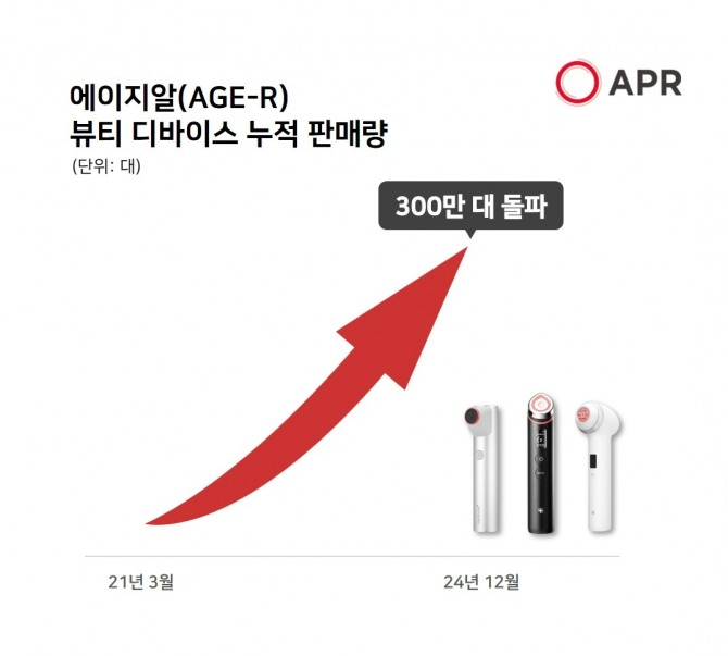 이미지 확대보기에이피알은 2024년 12월 기준, 에이지알 뷰티 디바이스의 글로벌 누적 판매량이 300만 대를 돌파했다고 밝혔다. 이는 2021년 3월 첫 번째 뷰티 디바이스 ‘더마EMS’를 출시한 이후 약 45개월 만에 달성한 기록이다.