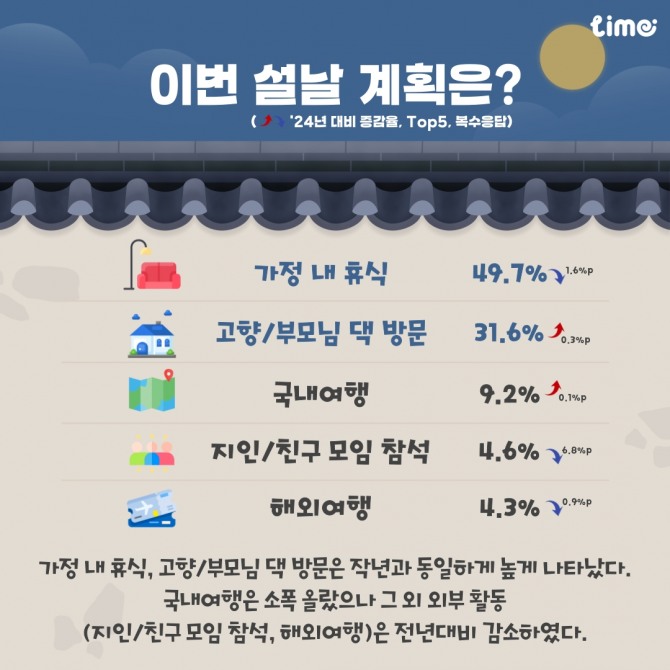 올해 1월 6일부터 7일까지 전국 20대 이상 남녀 2,000명을 대상으로 한 조사에 따르면, 이번 설 연휴 계획을 묻는 질문에 가정 내 휴식(49.7%), 고향·부모님댁 방문(31.6%)이라는 답변이 가장 많아 지난해와 동일한 흐름을 보였다.