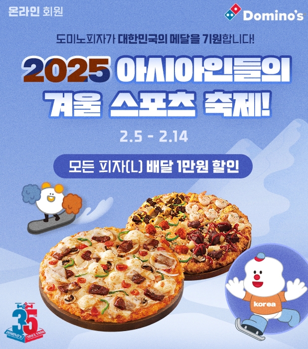 이미지 확대보기5일 도미노피자에 따르면 ‘2025 아시아인들의 겨울 스포츠 축제’ 프로모션은 이날부터 14일까지 대한민국 국가대표선수들의 선전을 회원들과 같이 응원하기 위해 기획한 것으로 모든 피자(L) 배달 주문 시 1만원 할인 혜택을 제공한다.