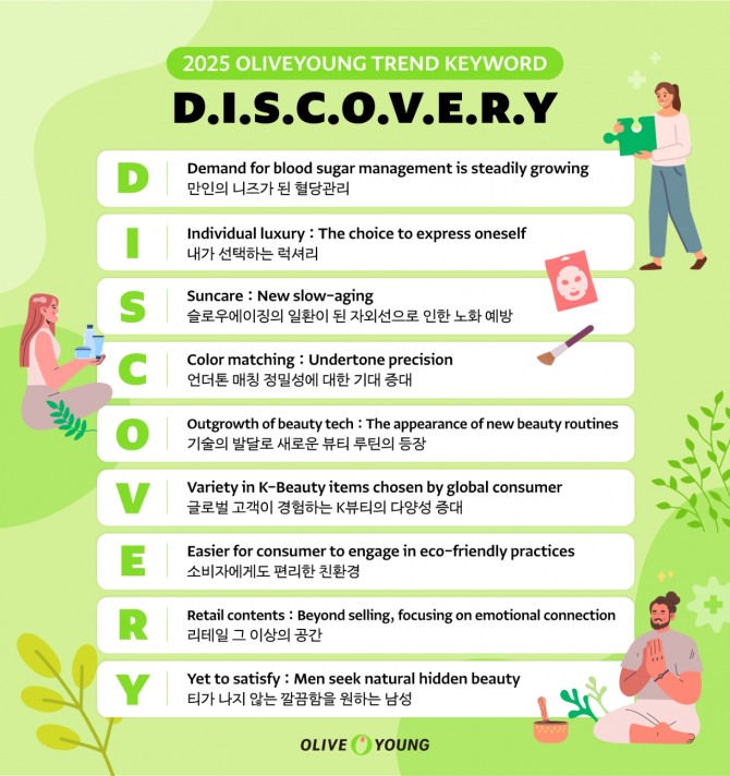이에 CJ올리브영이 지난해 1억6000만건의 구매 데이터를 결산하고 올해를 전망하는 2025 뷰티&헬스 트렌드 키워드로 ‘D.I.S.C.O.V.E.R.Y(발견)’를 선정했다고 11일 밝혔다. 개인 취향이나 선호에 따라 완전히 다른 상품과 서비스를 추구하는 초개인화 트렌드 아래 여러 가지 세분화된 흐름이 나타날 전망이다. 즉, 진짜 나를 ‘발견’하는 형태로 소비가 이뤄진다는 것이다.