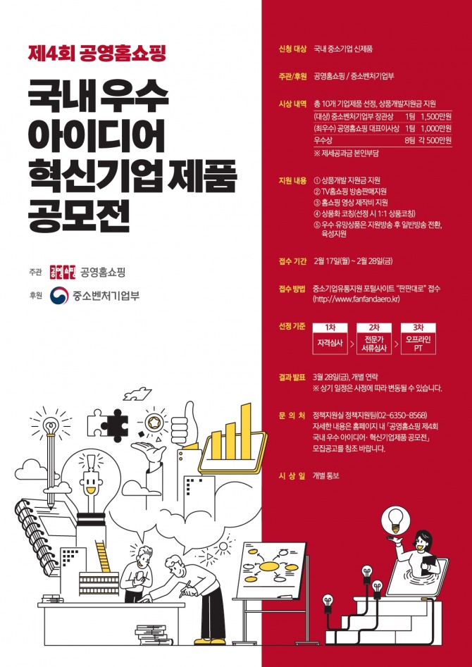 이미지 확대보기올해로 4회를 맞이하는 이번 공모전에서는 총 10개 기업 제품을 선발한다. 선정된 기업에게는 대상 1500만원(1팀), 최우수상 1000만원(1팀), 우수상 500만원(8팀)의 상품개발 지원금을 지급한다. 공영홈쇼핑 상품기획자(MD)와의 일대일 상품화 코칭부터 홈쇼핑 영상제작비 지원, TV홈쇼핑 판매방송 진행까지 원스톱 판로지원도 받을 수 있다.