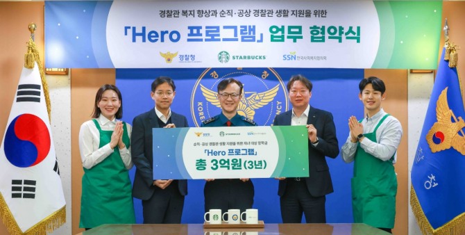 스타벅스는 18일 경찰청에서 경찰청, 한국사회복지협의회와 함께 경찰관 복지 향상 및 순직, 공상 경찰관과 가족 지원을 위한 ‘Hero 프로그램’ 업무협약식을 진행했다고 밝혔다.