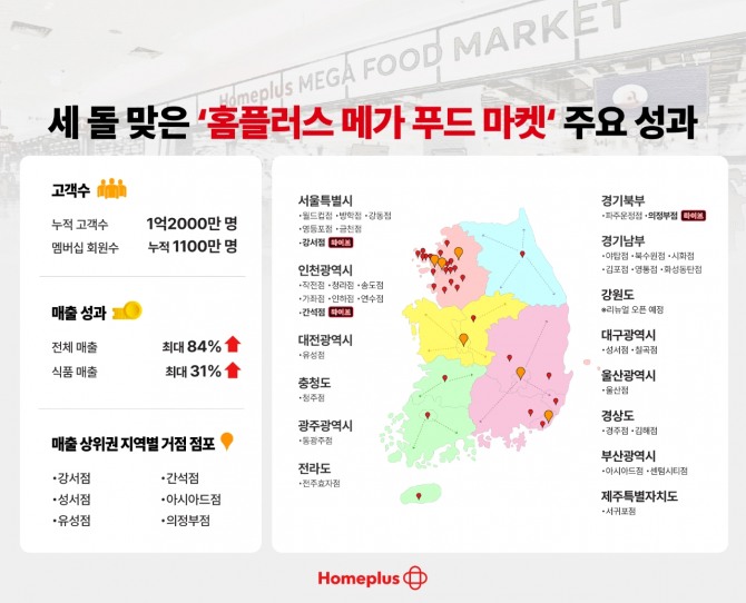‘세상 모든 맛이 다 있다’를 슬로건으로 내세우고 식품 매장 면적을 확대한 만큼, 식품 매출도 전년 동기 대비 최대 31% 올랐다. 3년 동안 ‘홈플러스 메가 푸드 마켓’의 성장을 이끈 지역별 거점 점포는 강서점, 간석점, 성서점, 아시아드점, 유성점, 의정부점 등이었다.