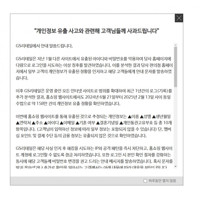 GS리테일은 “지난 1월 다른 사이트에서 유출된 아이디와 비밀번호를 악용하여 당사 홈페이지에 다량으로 로그인을 시도하는 이상 징후를 발견했다”며 “이를 분석한 결과 당사 편의점 홈페이지에서 고객의 개인정보가 유출된 정황을 인지하고 해당 고객들에게 안내 문자를 발송했다”고 설명했다.