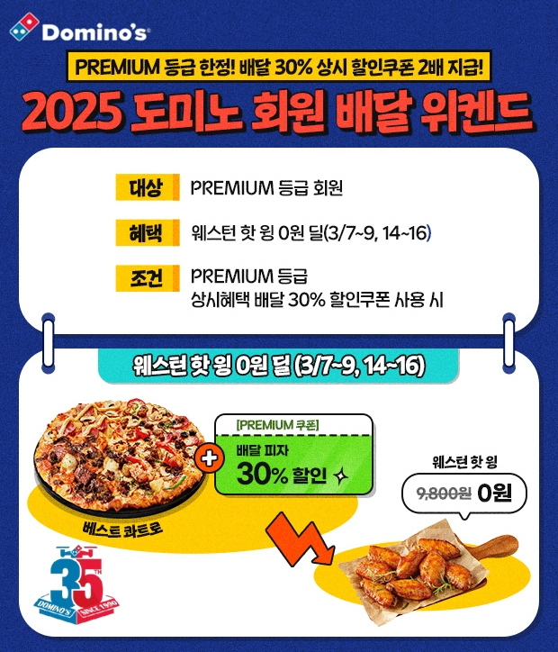 도미노피자 프리미엄 등급 회원이 3월 7~9일 또는 3월 14~16일중에 30% 배달 할인 쿠폰을 사용해 주문 시 도미노피자의 인기 사이드 메뉴인 웨스턴 핫윙을 무료로 받을 수 있다.