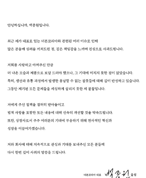 그는 “저희를 사랑하고 아껴주신 만큼 더 나은 모습과 제품으로 보답 드려야 했으나, 그 기대에 미치지 못한 점이 많았다. 특히, 생산과 유통과정에서 발생한 용납할 수 없는 잘못들에 대해 깊이 반성하고 있다”고 강조했다.