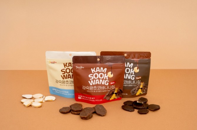 먼저 바나나 전문 글로벌 청과기업 스미후루코리아의 ‘감숙왕 초코 바나나칩’이 있다. 감숙왕 바나나에 초콜릿 코팅을 더한 원물 간식이다.