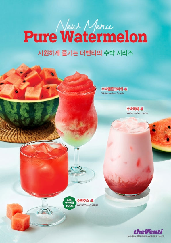 이미지 확대보기‘수박주스’는 수박 과즙 100%를 함유해 시원함을 전달하며, ‘수박라떼’는 수박과 우유의 조합으로 라떼를 선호하는 고객을 겨냥해 선보인다. ‘수박멜론크러쉬’는 수박 아이스크림을 연상시키는 비주얼에 수박과 멜론의 조화를 느낄 수 있다.