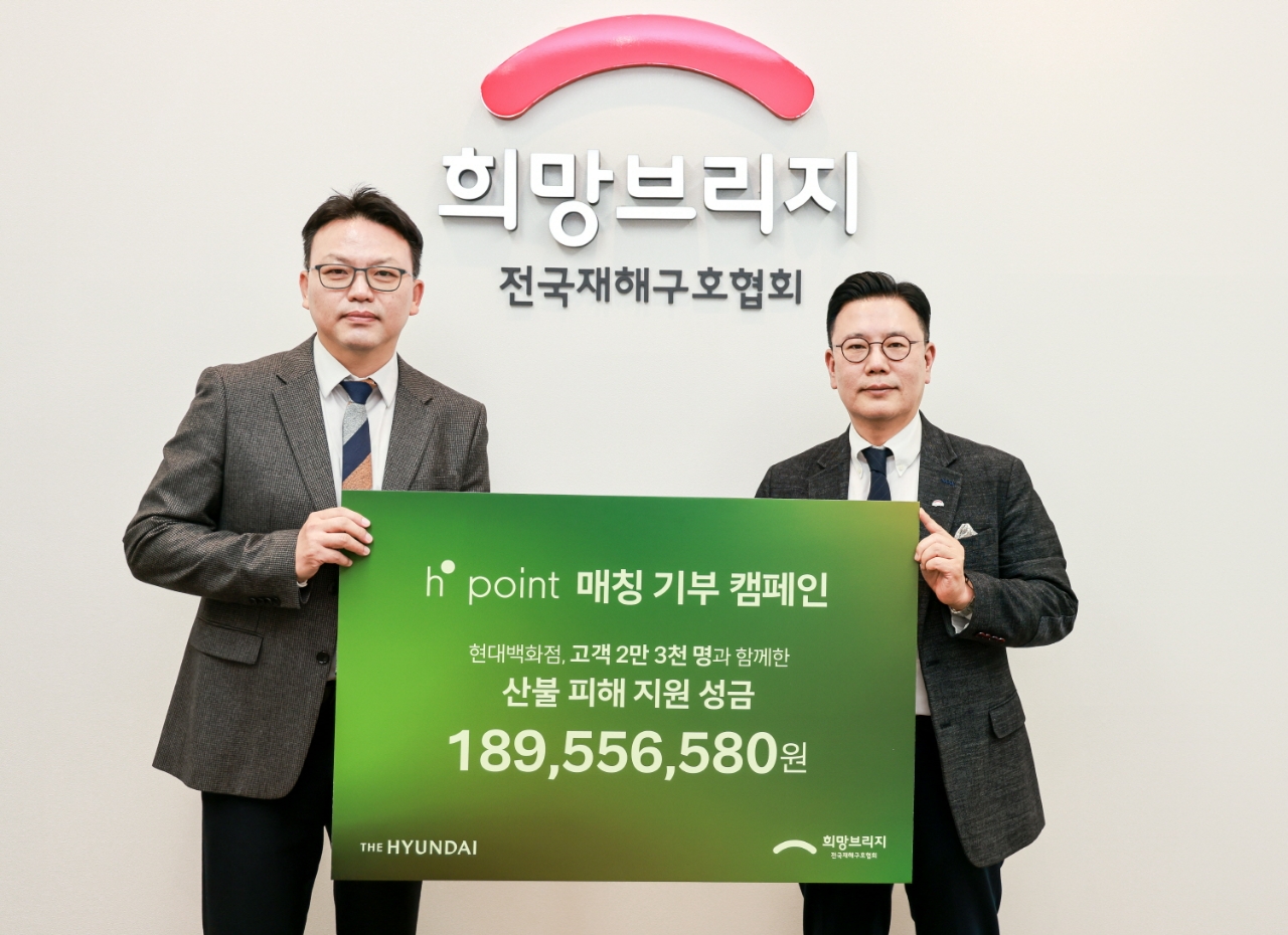 희망브리지 신훈 사무총장은 “현대백화점과 고객 여러분의 따뜻한 마음에 깊이 감사드린다”며 “피해 주민들이 하루빨리 일상으로 복귀할 수 있도록 희망브리지는 최선을 다하겠다”고 말했다.